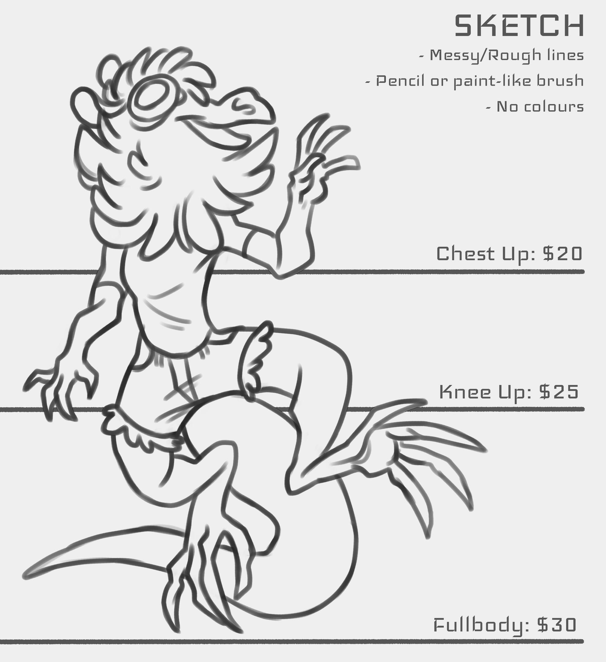 Sketches are drawings done with a pencil-like brush, can look messy and rough. No clean lineart. No colours.• Chest Up: $20